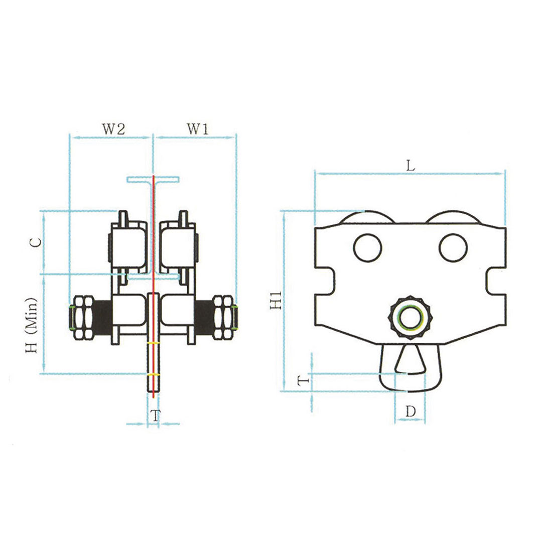 Product Code Capacity (tonne) Dimensions Min. Curve Radius (mm) Beam Flange Width (mm) Net Weight (kg) Technical Drawing